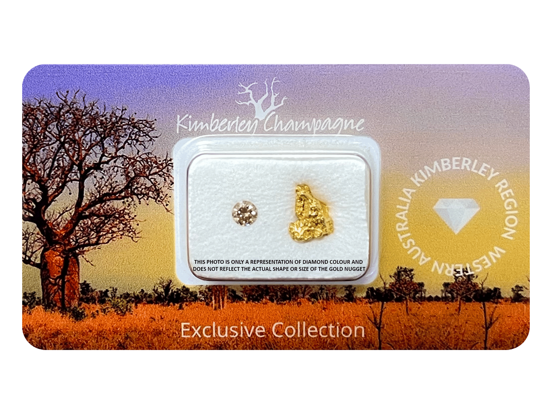 This collector’s item showcases a certified Australian champange diamond from the Argyle Mine, sealed alongside natural Australian gold nuggets. Each piece is beautifully presented in a display box and comes with an Kimberley Champagne Authenticity Certificate, making it a unique and meaningful keepsake or gift.