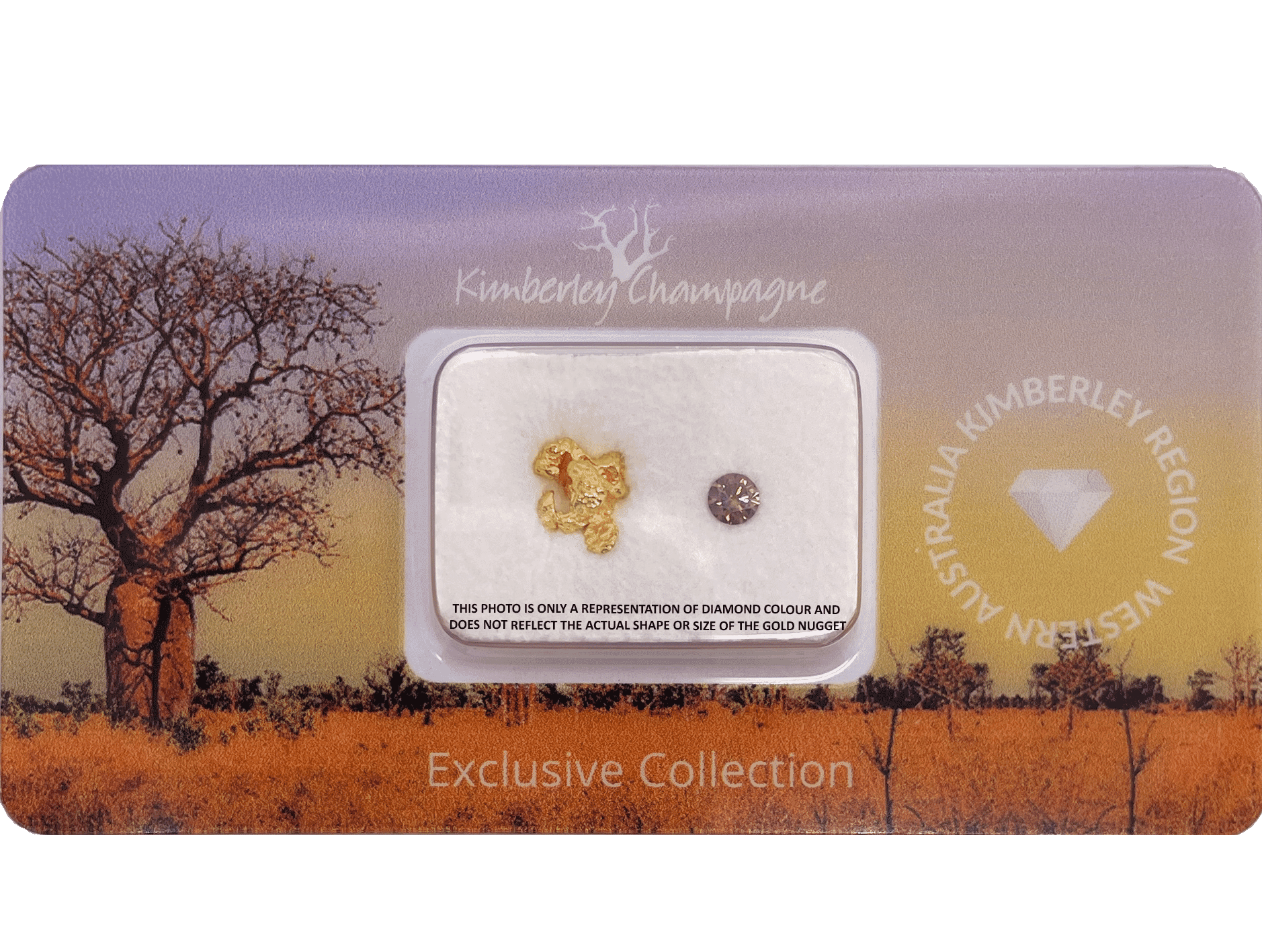 This collector’s item showcases a certified Australian champange diamond from the Argyle Mine, sealed alongside natural Australian gold nuggets. Each piece is beautifully presented in a display box and comes with an Kimberley Champagne Authenticity Certificate, making it a unique and meaningful keepsake or gift.